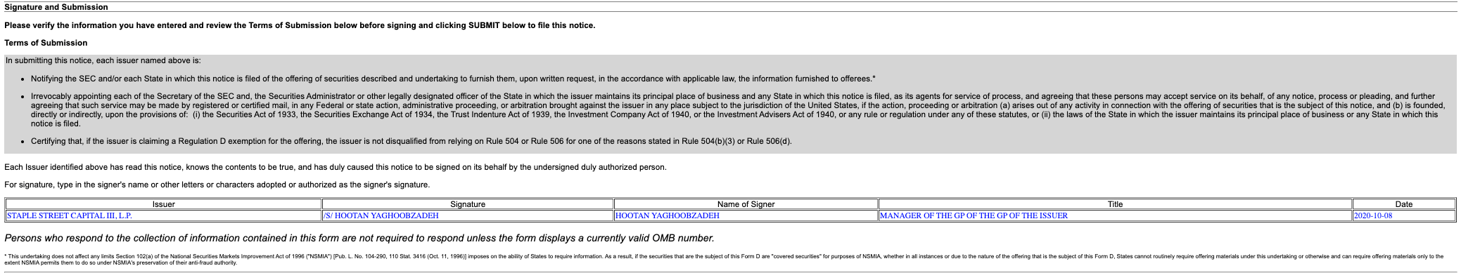 Staple Street Capital III, L.P. sold $400 million in securities to UBS Securities Co., Ltd. as reveled 12:15 today, Dec. 1, by attorney Lin Wood in a cryptic tweet to a link to the sale’s SEC Form D.