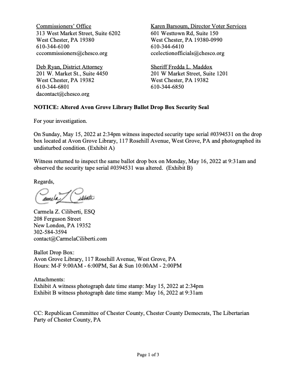 Carmela Ciliberti has informed the Chester County Commissioners, Voter Services Director Karen Barsoum, District Attorney Deb Ryan and Sheriff Fredda Maddox and provided photographic evidence.