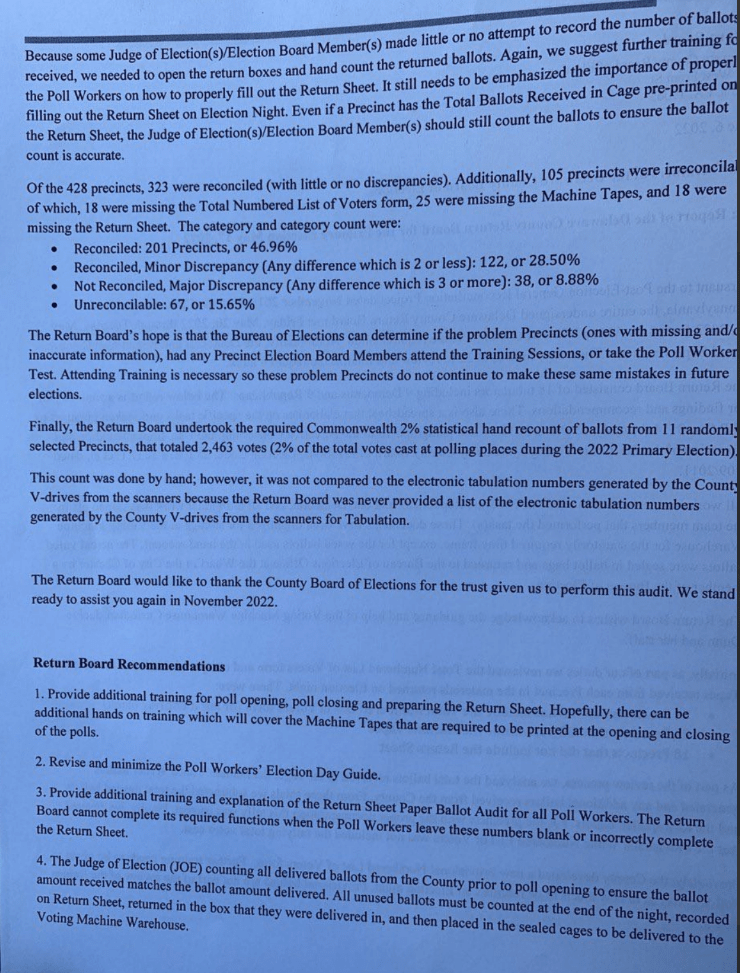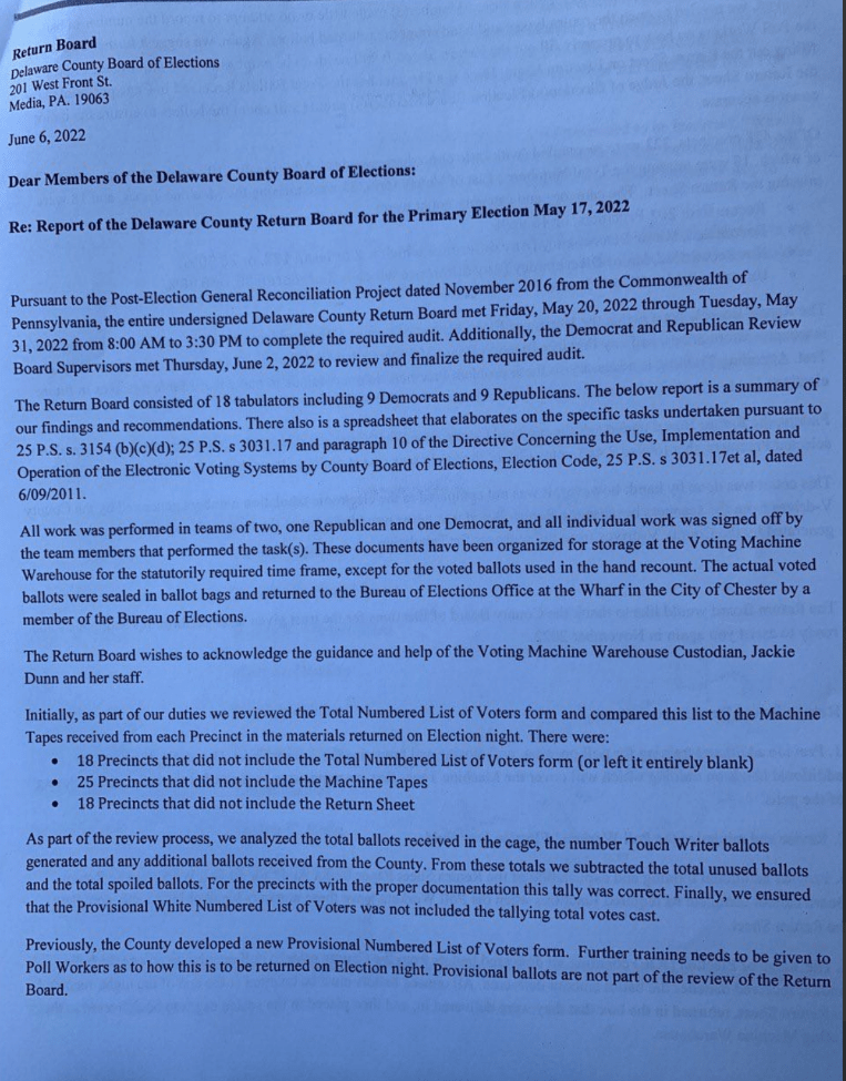 In the May 17 Primary, 105 of Delco’s 428 precincts were not reconciled due to major discrepancies (38 precincts) or just flat out unreconcilable (67 precincts) according to the bi-partisan county Return Board.