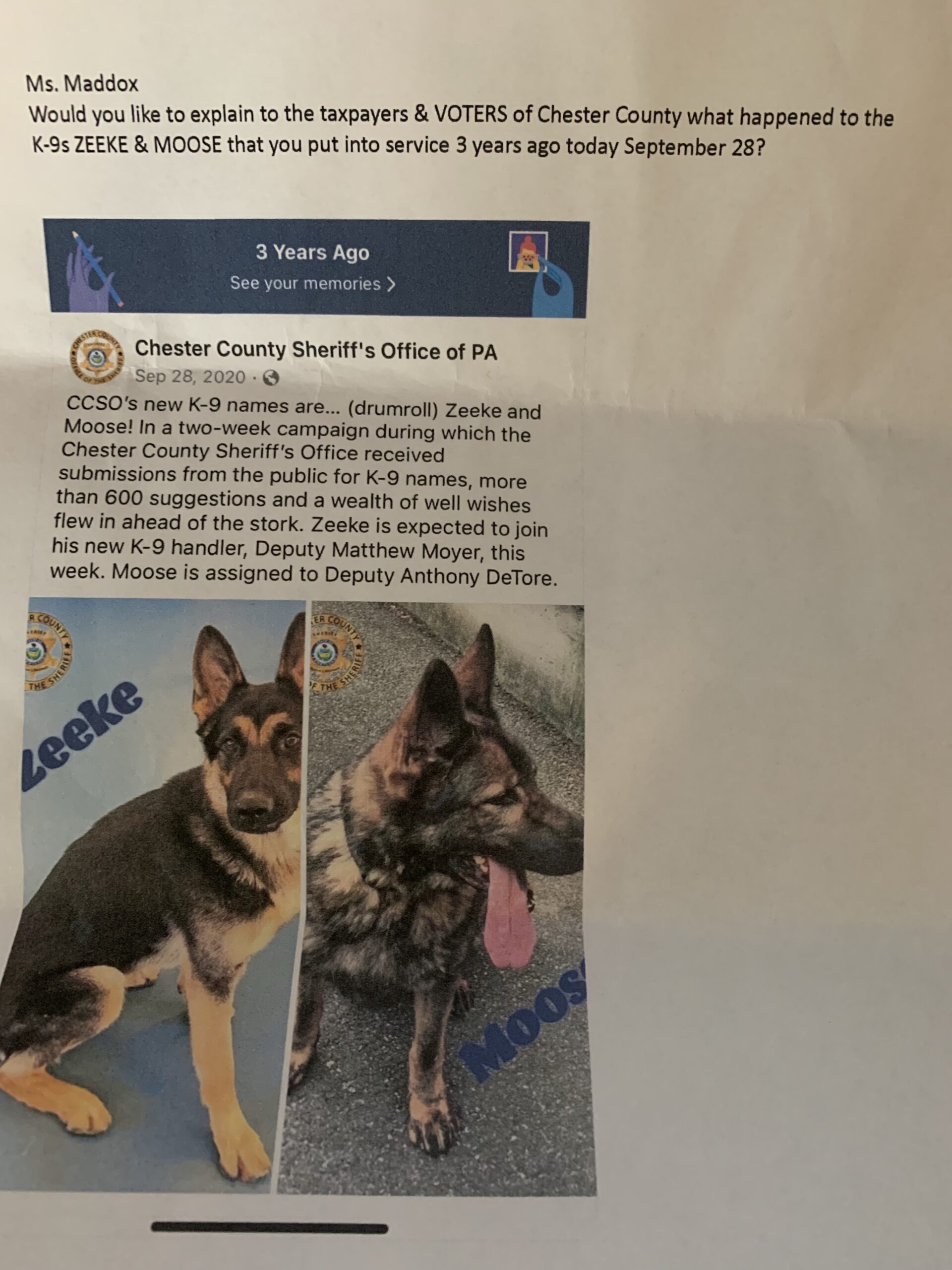 What Happened To Zeeke And Moose? — Nine months after taking office Chester County Sheriff Fredda Maddox announced the acquisition of Zeeke and Moose to her department’s K-9 unit.