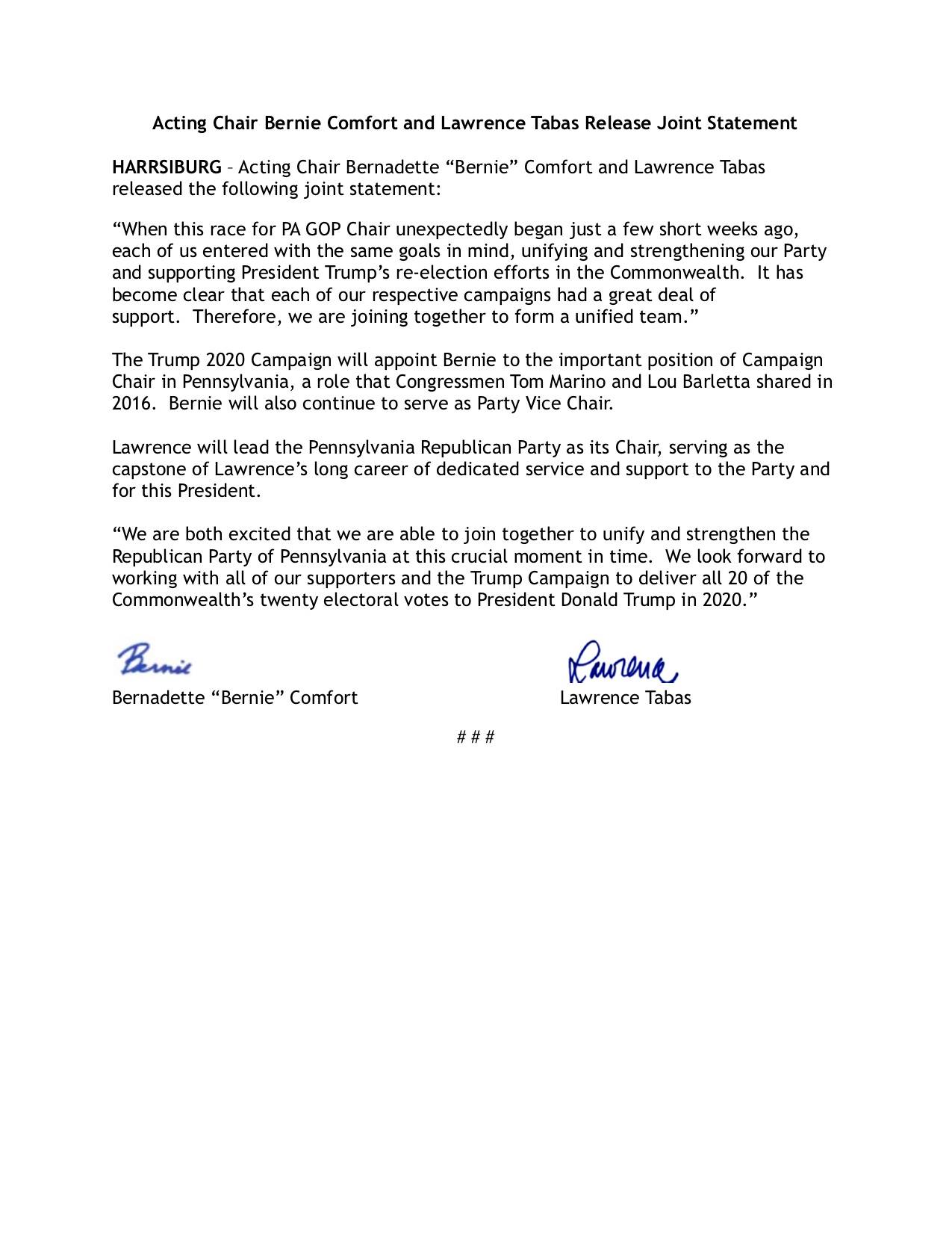 Update: A joint statement by Tabas and Ms. Comfort says Ms. Comfort will remain vice chair and serve as President Trump’s campaign chair for Pennsylvania. See image below.