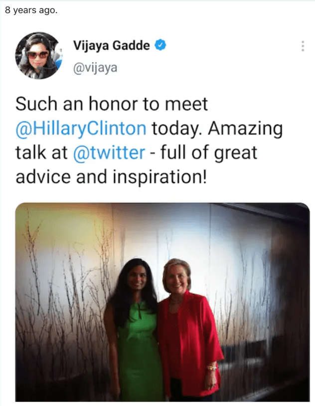 Vijaya Gadde 8 Years Ago. She ran the legal, policy, and trust Department at Twitter before her being fired by Elon Musk on Oct. 27, 2022. She claimed to be fair. She wasn’t.