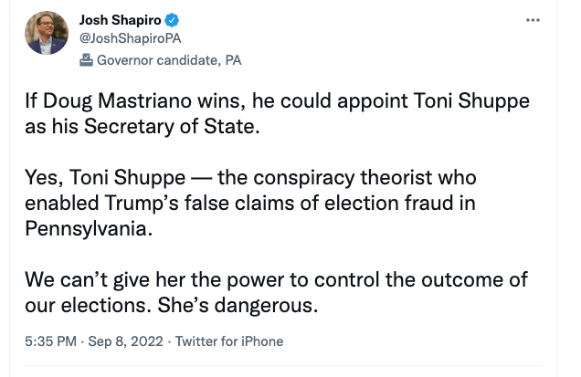 Shapiro, in his tweet, said: If Doug Mastriano wins, he could appoint Toni Shuppe as his Secretary of State. Yes, Toni Shuppe — the conspiracy theorist who enabled Trump’s false claims of election fraud in Pennsylvania. We can’t give her the power to control the outcome of our elections. She’s dangerous.