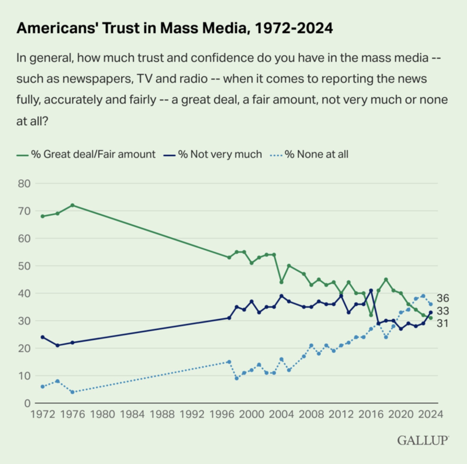 Media Trust History At A Glance — A shocking way America has change is illustrated in the below graph via Gallup. In 1976 — the year All the President’s Men came out — more than 70 percent of us trusted major media. Less than 50 percent had no trust.